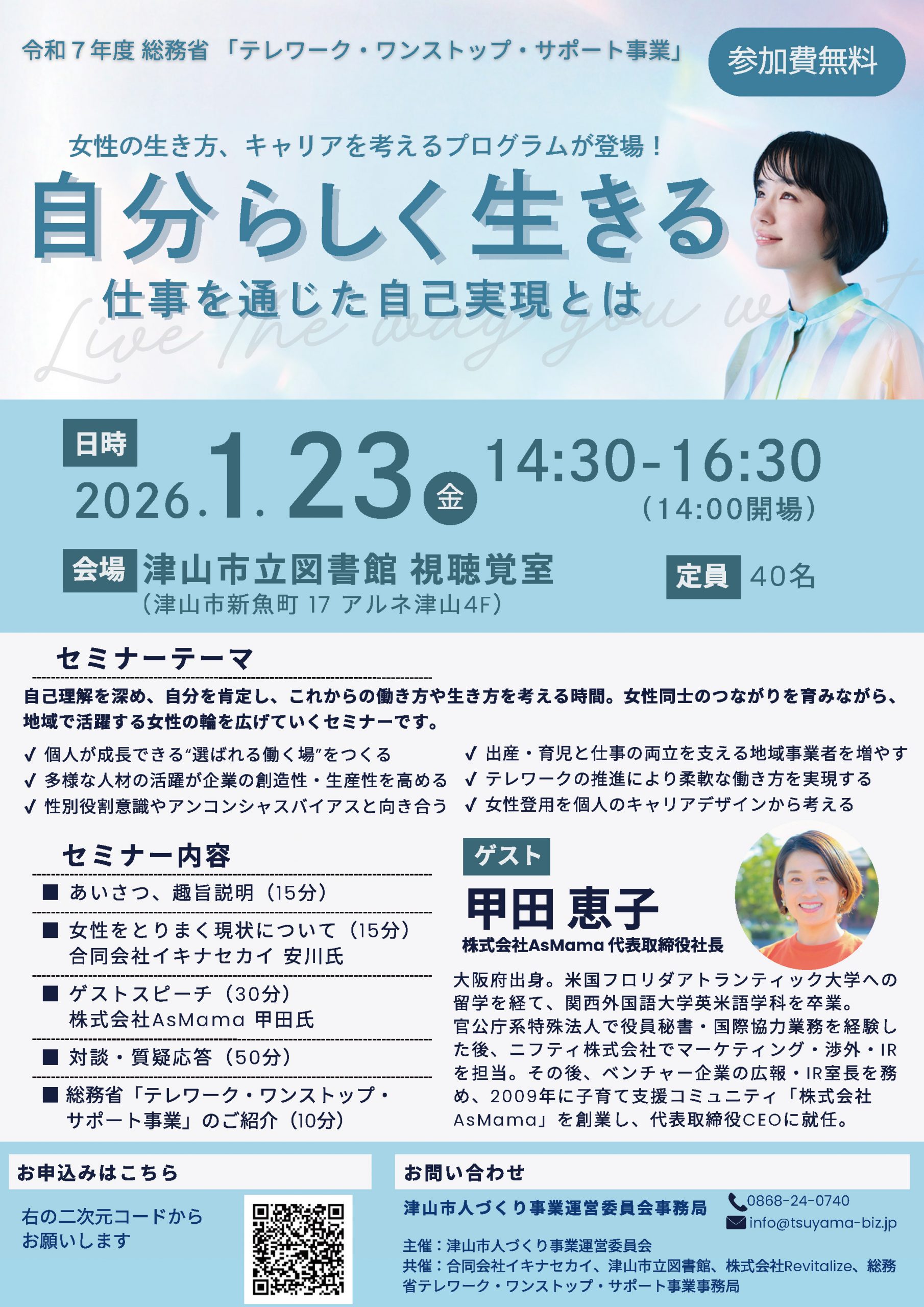 地域活性化施策を展開しながら関係人口を増やすとともに、「誰もが産み、育て、働きやすい」持続可能な共助コミュニティを実現します。