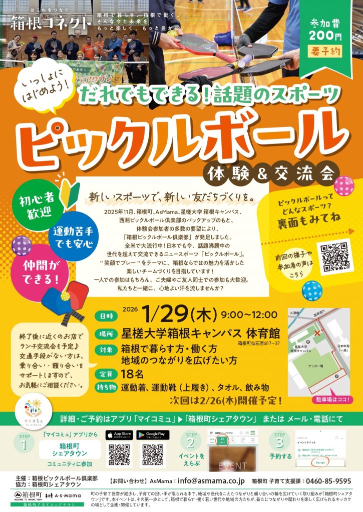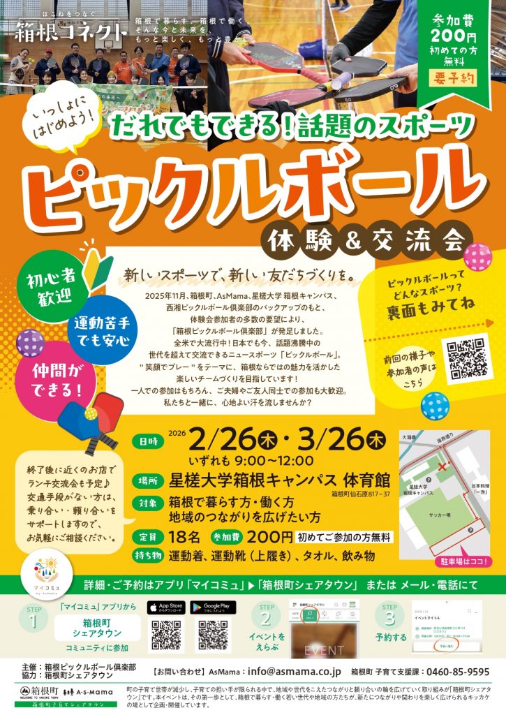 マイコミュアプリ「箱根町シェアタウン」交流イベントタブからご予約ください。
