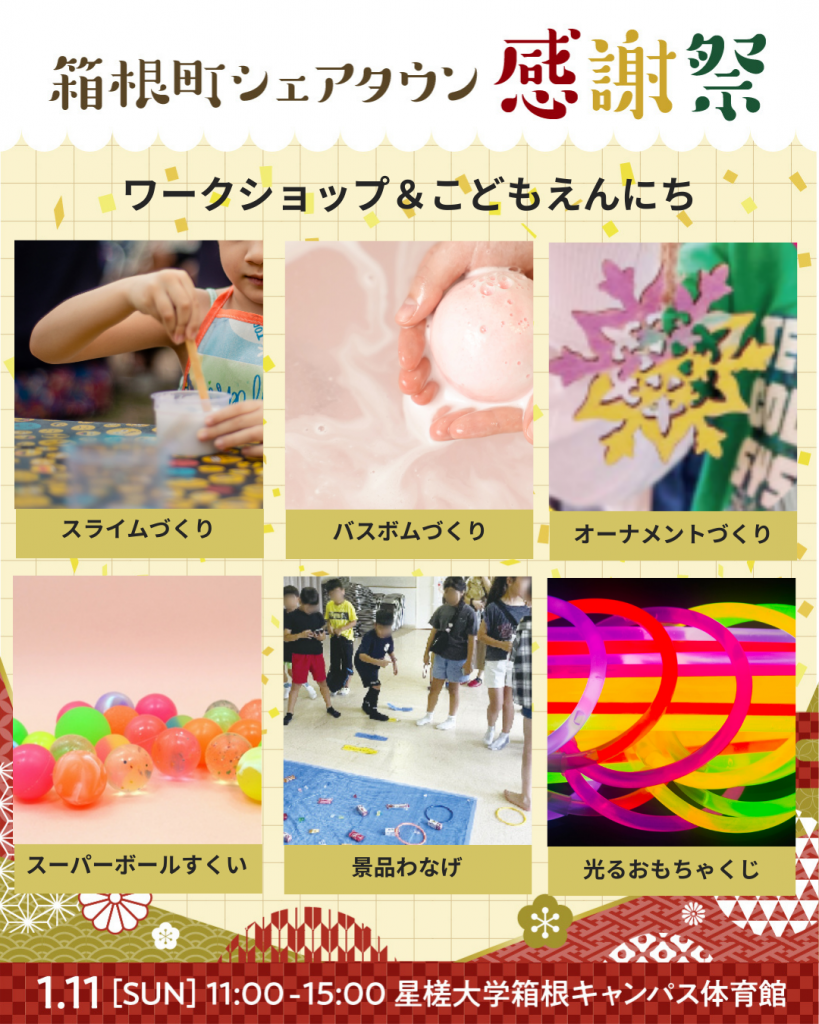 子育ての頼り合い「はこねっこ みまもるーむ」や、町民の得意をシェアする「一日先生」、箱根で働く・暮らす人のつながりづくり「箱根コネクト」など、これまでの箱根町シェアタウンの交流イベントで好評だった体験が大集合!