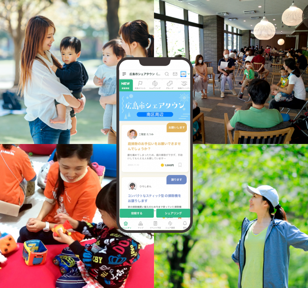 「ゆめタウン」や「東雲商店会」等多様な場所やステークホルダーとの協働で、住民の皆さんが集い、学びあう場をつくることに加え、「マイコミュ」アプリを通じて、地域情報や生活・子育てを頼り合える地域をつくります。