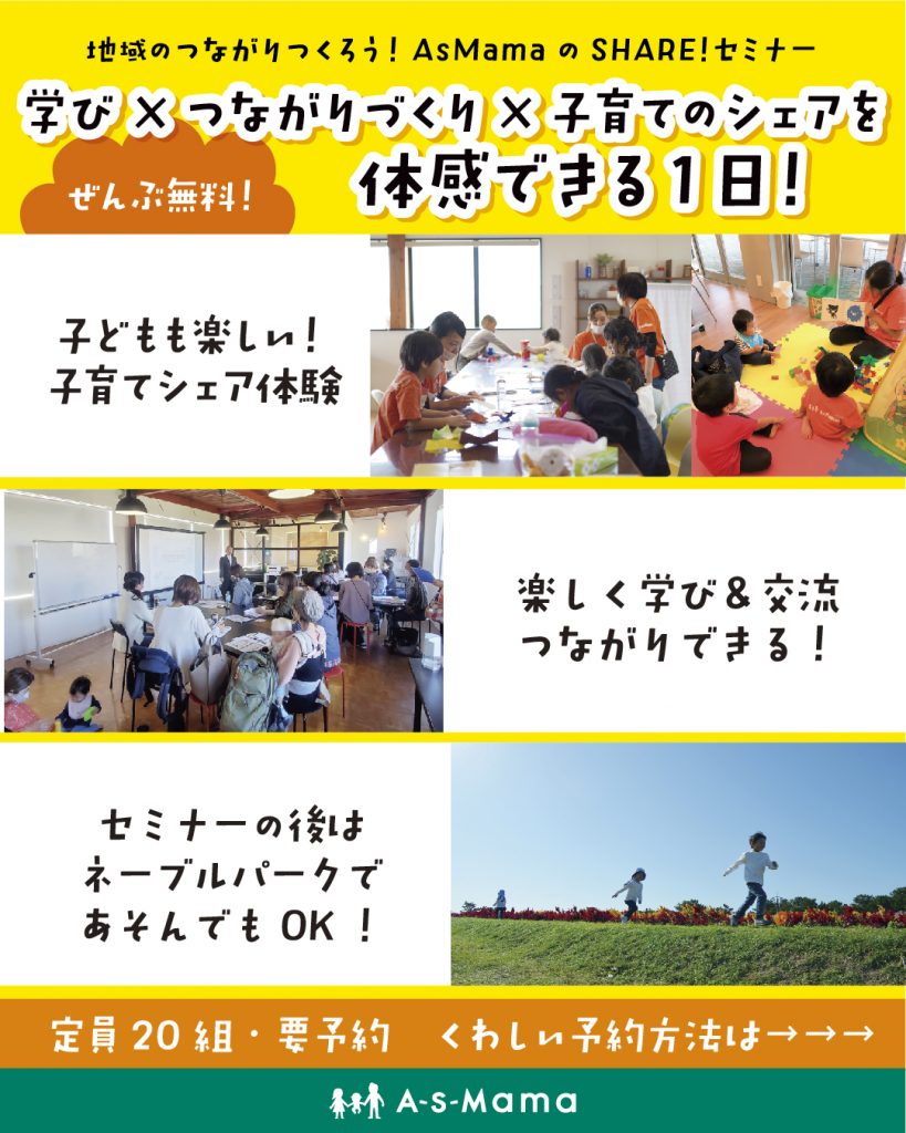 0歳はセミナー会場にご一緒いただき、AsMama認定・地域サポーター「シェア・コンシェルジュ」が参加をサポートいたします。