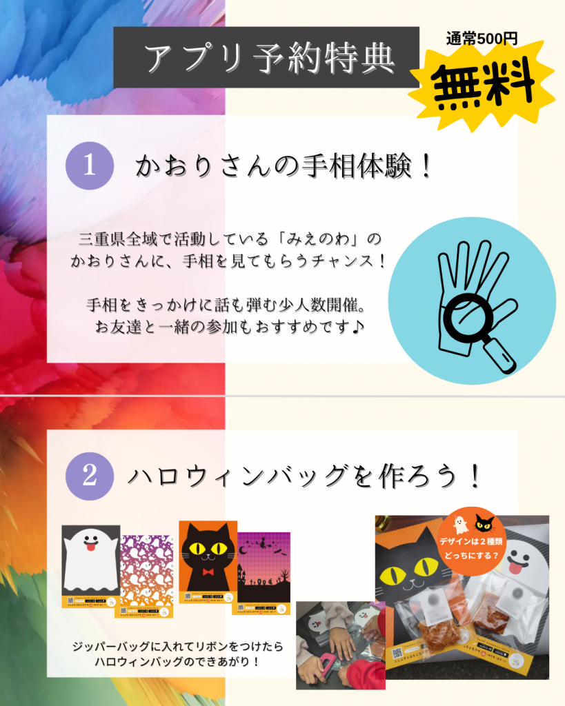 「手相体験」「ハロウィンバッグ作り」が500円→ 無料 になる予約特典は、マイコミュアプリ「鳥羽市シェアタウン クラシェアとば」 で予約受付中!