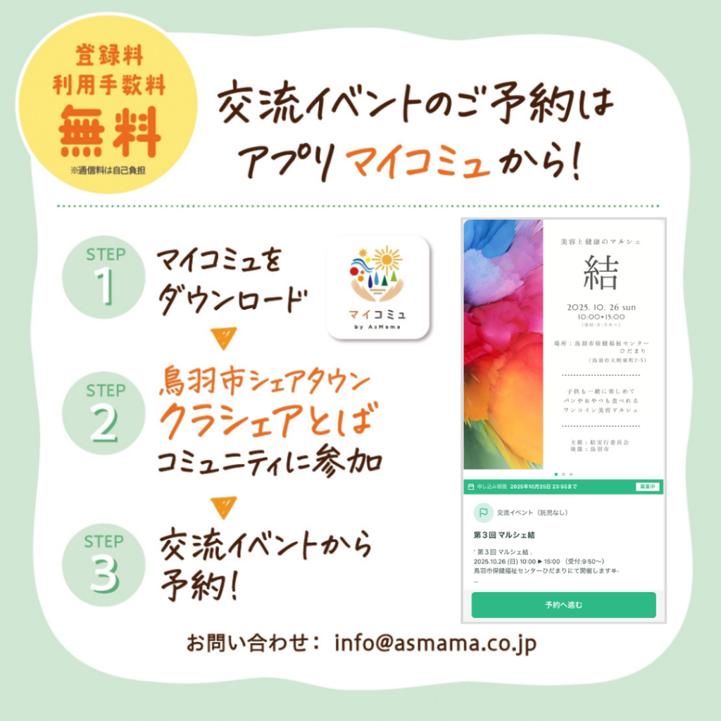 アプリ予約で「アロマバスボムづくり」が500円→無料に!マイコミュアプリ「鳥羽市シェアタウン クラシェアとば」交流イベントタブから当該イベントの「予約する」ボタンをタップ!