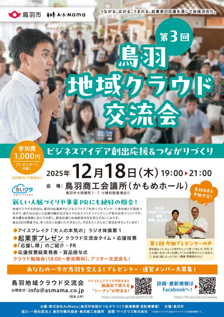 鳥羽で起業を目指す方やビジネスアイデアをもった方、創業5年未満の起業家たち5名が自身の想いを語り、地域住民が1,000円を手に集い共感した起業家に応援投票、得票数に応じて賞金(商品券)で還元する――そんな新しいかたちの地域活性イベント「地域クラウド交流会(※)」の第3回めを鳥羽市にて開催します。